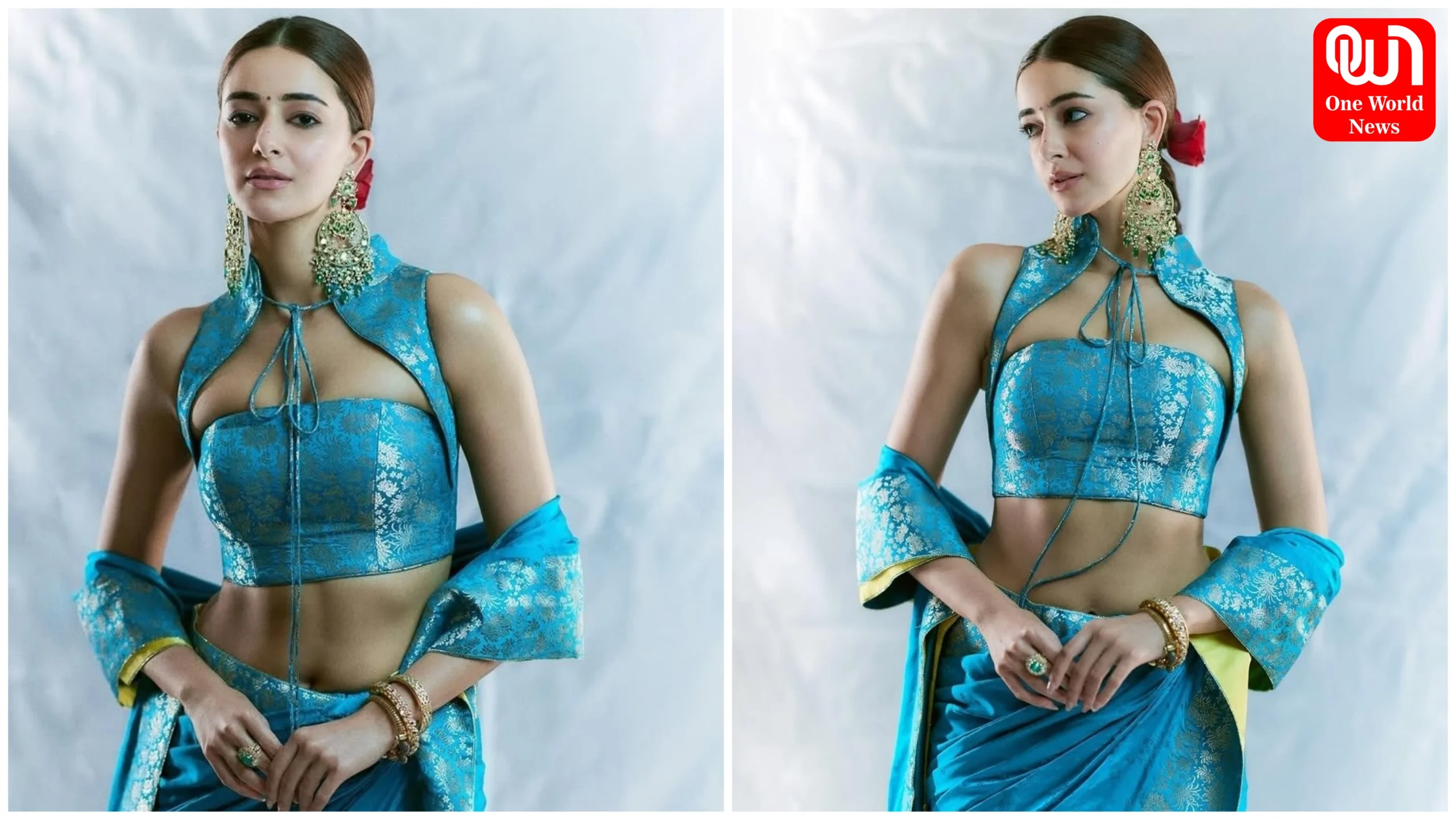 এই বেনারসি শাড়ির ব্লাউজের ডিজাইনটিও খুব সুন্দর। এটি ট্রাডিশনাল এবং ওয়েস্টার্ন ছোঁয়া মিশ্রিত করে অনন্যা পান্ডের সামগ্রিক লুককে আরও বাড়িয়ে তুলেছে। মসৃণ হল্টার নেক ব্লাউজটিতে একটি ড্রস্ট্রিং রয়েছে, যা অভিনেত্রীর নেক লাইনের উপর পুরোপুরি ফোকাস করে।