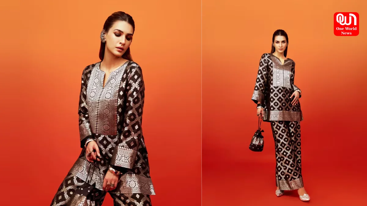 কৃতি শ্যাননের কালো বেনারসি কুর্তা সেটটিতে সুন্দর কারুকার্য রয়েছে। রুপোলি জরির কাজ এই পোশাকের সৌন্দর্যকে আরও বাড়িয়ে তুলেছে। তাছাড়া, এটি কৃতি শ্যাননের সামগ্রিক ব্যক্তিত্বকে নিখুঁতভাবে তুলে ধরে।