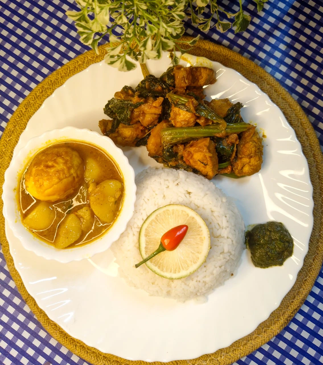 • চিকেন এবং শাক সেদ্ধ হয়ে এলে সবশেষে উপর থেকে কাঁচালঙ্কা কুচি ছড়িয়ে গরম ভাতের সাথে পরিবেশন করলেন আসামি স্টাইল চিকেন কারি।