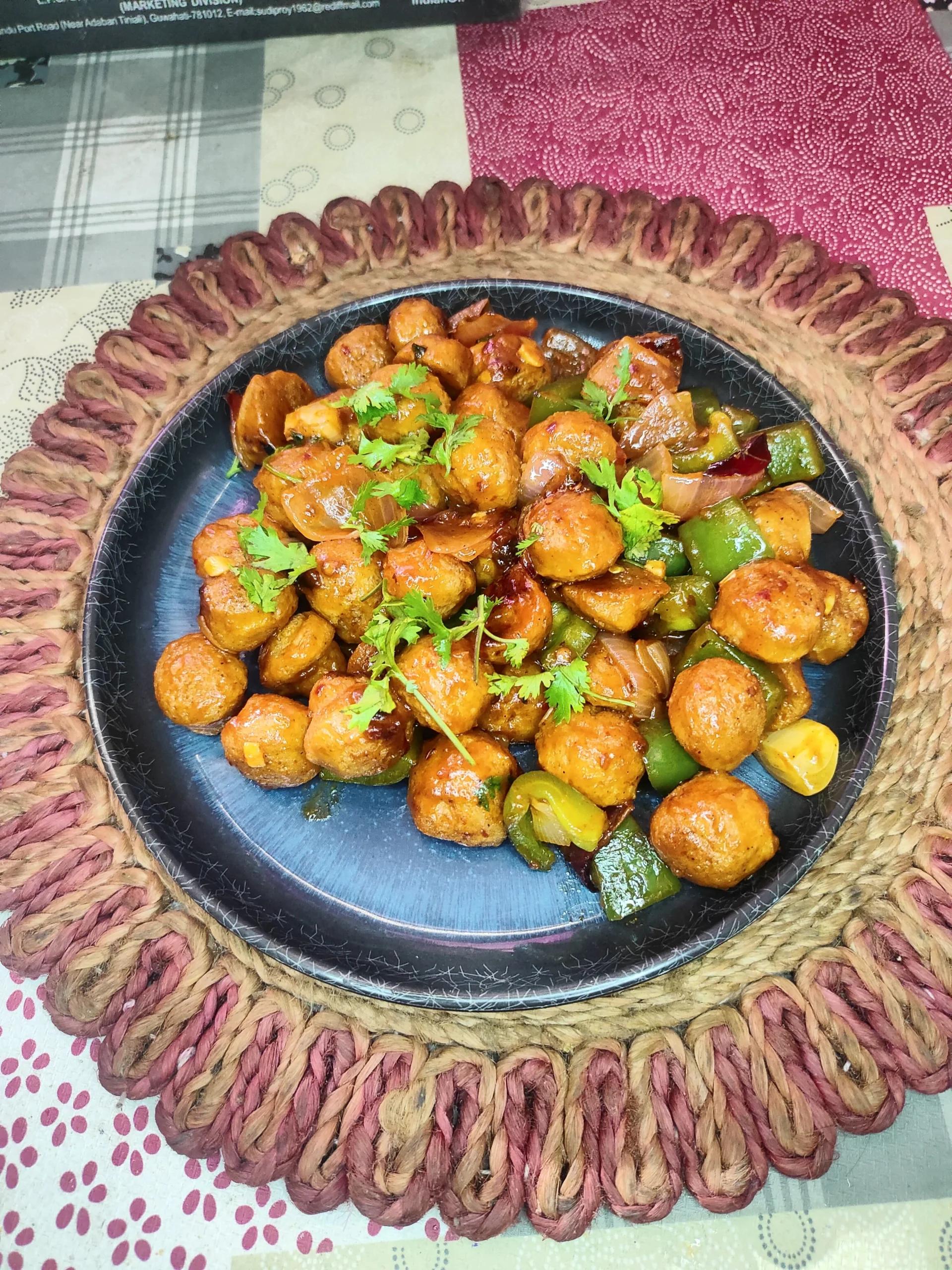 • এবার উপর থেকে ধনেপাতা কুচি ছড়িয়ে রুটি বা পরোটার সাথে পরিবেশন করার জন্য তৈরি হয়ে গেল সয়া চিলি।